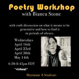Poetry Workshop April 16th 6:30-8:45pm ET April 23rd 6:30-8:45pm ET April 30th 6:30-8:45pm ET May 14th 6:30-8:45pm ET with Bianca Stone Registration is closed. Virtual